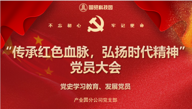 2021年5月24日上午,为庆祝中国共产党成立100周年,传承并讲好党的故事、英雄的故事,国贸科技园产业园分公司党支部召开“传承红色血脉,弘扬时代精神”党员大会。