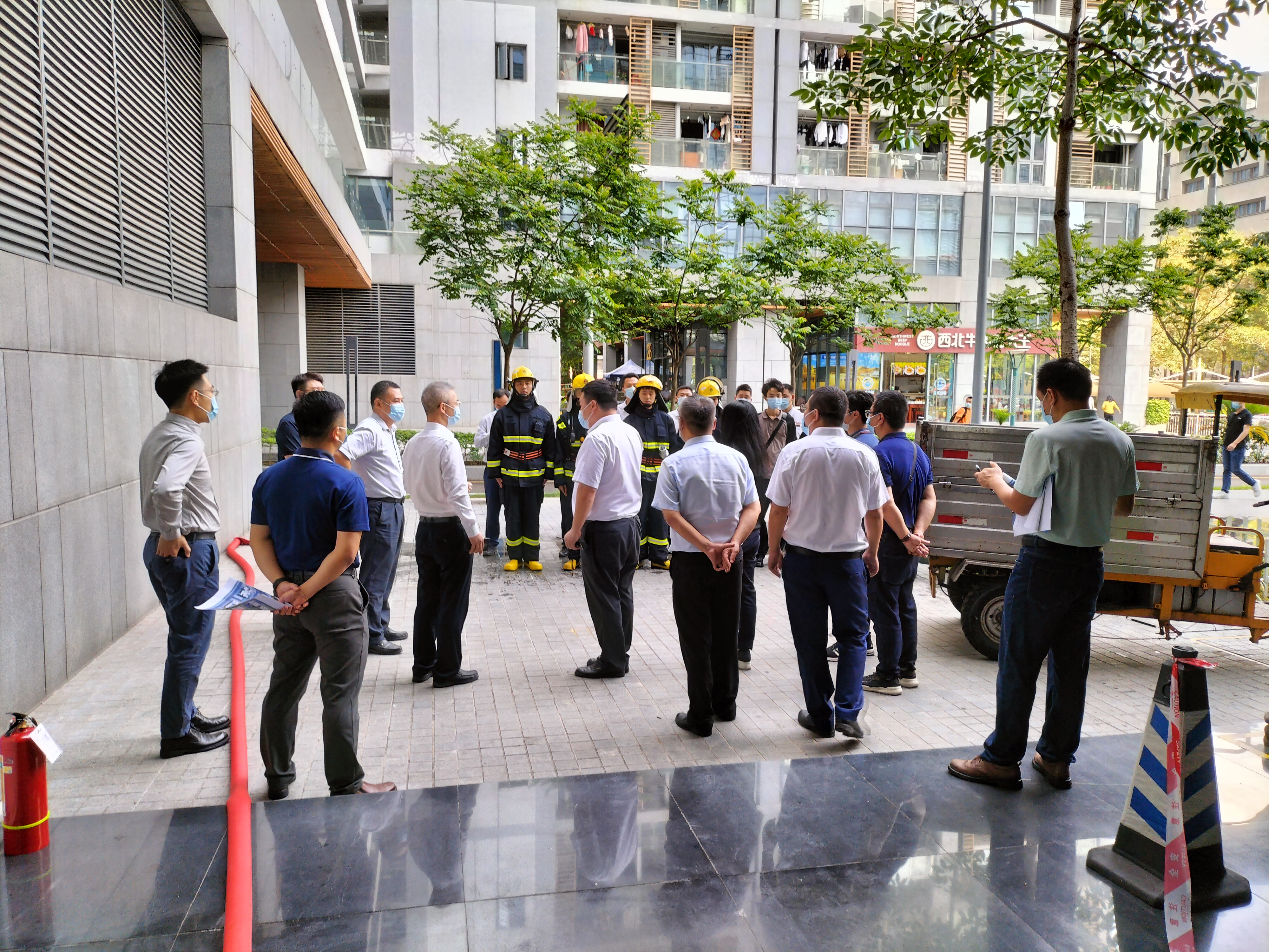 本次检查重点模拟园区突发火灾状况,从实战出发,采取“不打招呼、不设警情、不定时间、不定地点”的方式,以严格考验园区应急响应能力。检查工作组于现场随机启动火灾报警按钮,园区消防队在毫不知情的状态下闻声而动,迅速着装、携带装备、器材奔赴现场,并设置最佳水枪阵地出水灭火,整个应急响应过程仅用时3分钟,应急响应能力受到了深圳湾公司领导的赞扬和肯定。