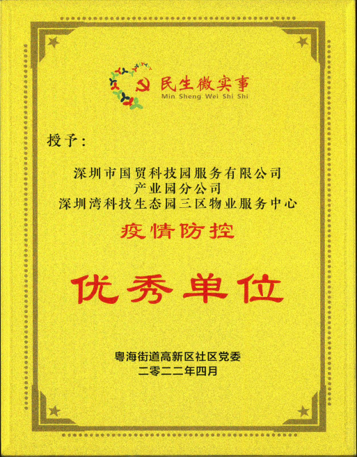 6月16日,南山区粤海街道高新区社区党委组织召开辖区疫情防控工作表彰大会,国贸科技园公司(产业园分公司)深圳湾科技生态园项目一二区、三区、四区,创投创智大厦项目、创新科技中心项目等5个物业服务中心均被授予“疫情防控优秀单位”称号。
