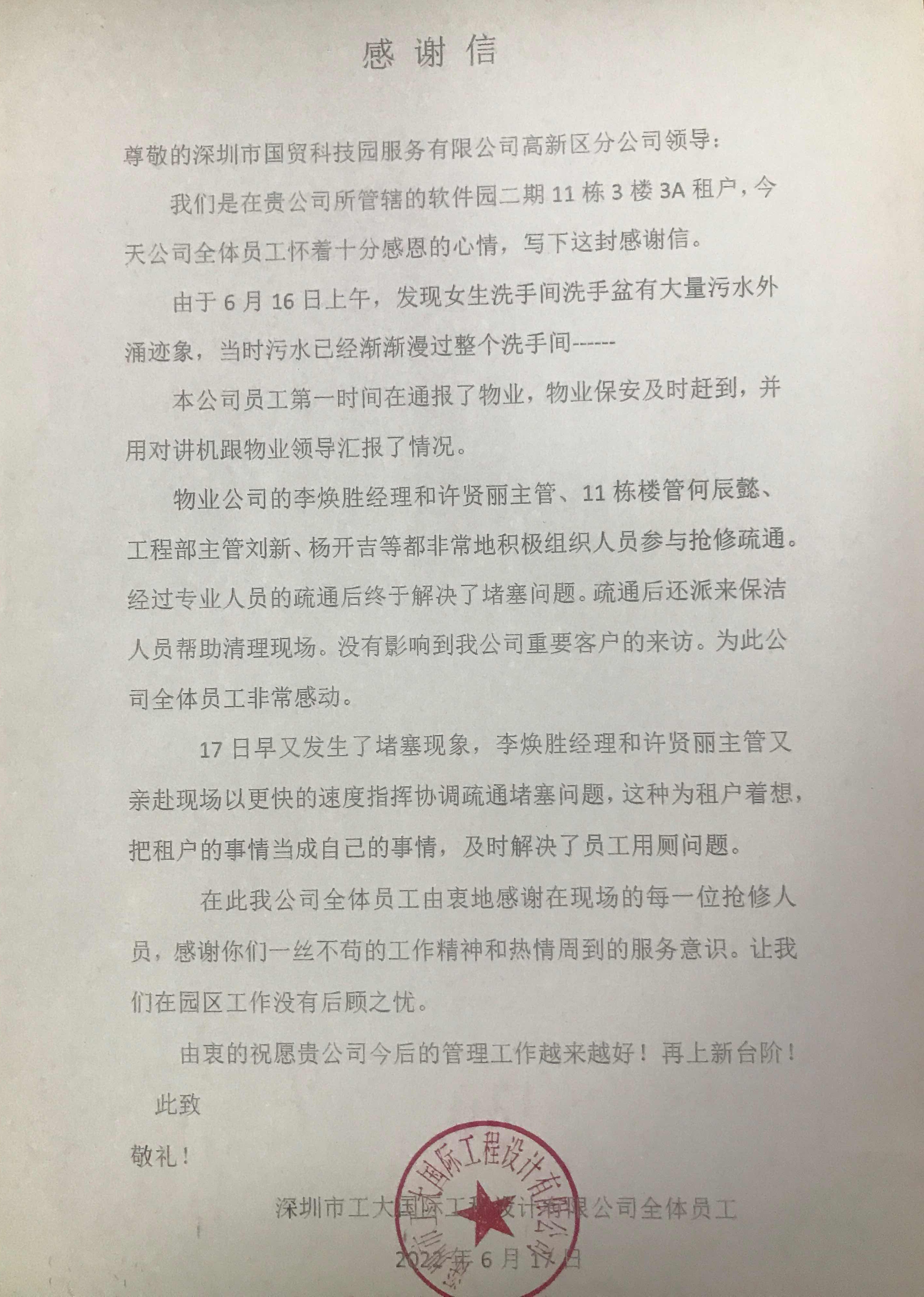 近日,深圳市工大国际工程设计有限公司(以下简称工大国际公司)给国贸科技园高新区分公司软件园二期管理处送来一封感谢信,对管理处及时解决楼内卫生间堵塞问题给予高度认可和感谢。