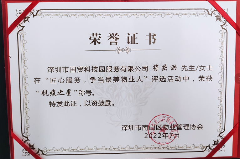 近日,深圳市南山区物业管理协会开展“匠心服务,争当最美物业人”评选表彰活动。国贸科技园公司(产业园分公司)生态园项目一二区符庆洪凭借稳扎稳打、踏实肯干的工作态度和作风,获评“抗疫之星”。