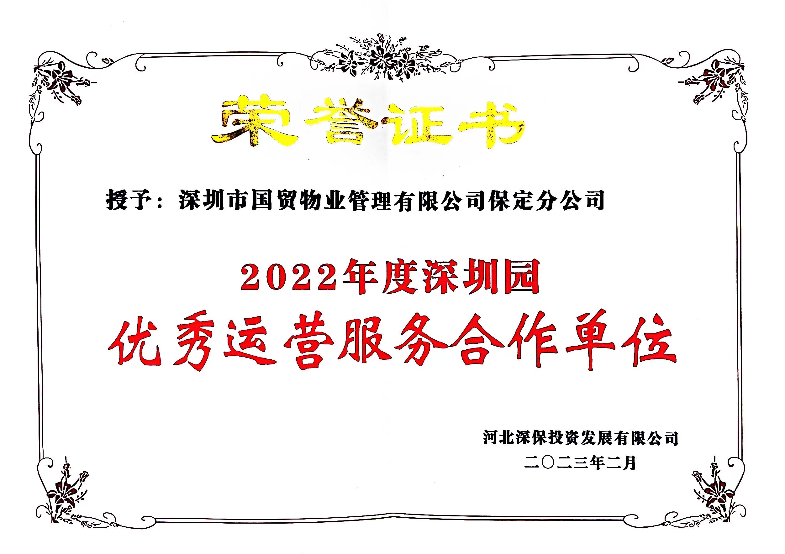 保定分公司荣获河北深保投资发展有限公司(以下简称“深保发展”)表彰并被授予“2022年度深圳园优秀运营服务合作单位”称号。深保发展对国贸物业保定分公司2022年度各项服务与保障工作给予了肯定和表扬,对兢兢业业、默默付出的工作人员表示感谢。