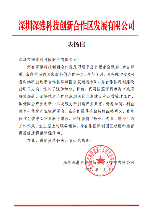 2024年1月3日,深圳深港科技创新合作区发展有限公司给国贸物业板块国贸科技园公司发来表扬信,对国创项目服务团队的专业物业服务保障工作给予充分肯定。