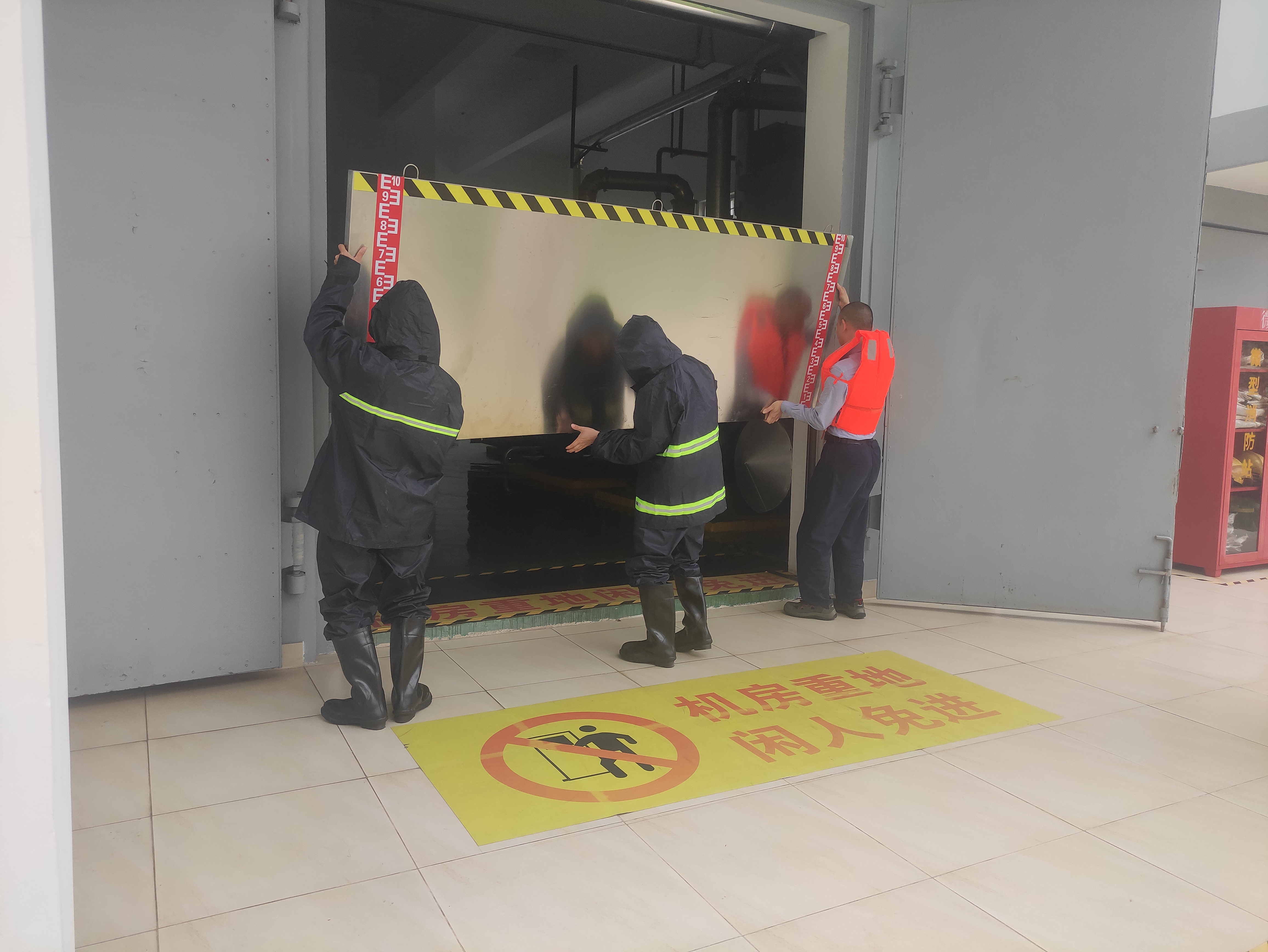 此次演练以深圳遭遇连日暴雨、生物孵化器项目水位上涨、污水站地下操作间因暴雨发生雨水倒灌为背景。项目人员接到险情报告后,即刻启动防汛应急预案,各应急小组立刻集合到位,现场应急小组、设备组换好防护服装后有序开展各项应急工作,应急小组负责安装污水站及各设备房的挡水板,并将沙袋运送至现场;设备组兵分两队,一队到现场安装抽水泵准备抽水,另一队检查各设备房设备运行情况。各小组服从指挥调度,各司其职、配合默契。